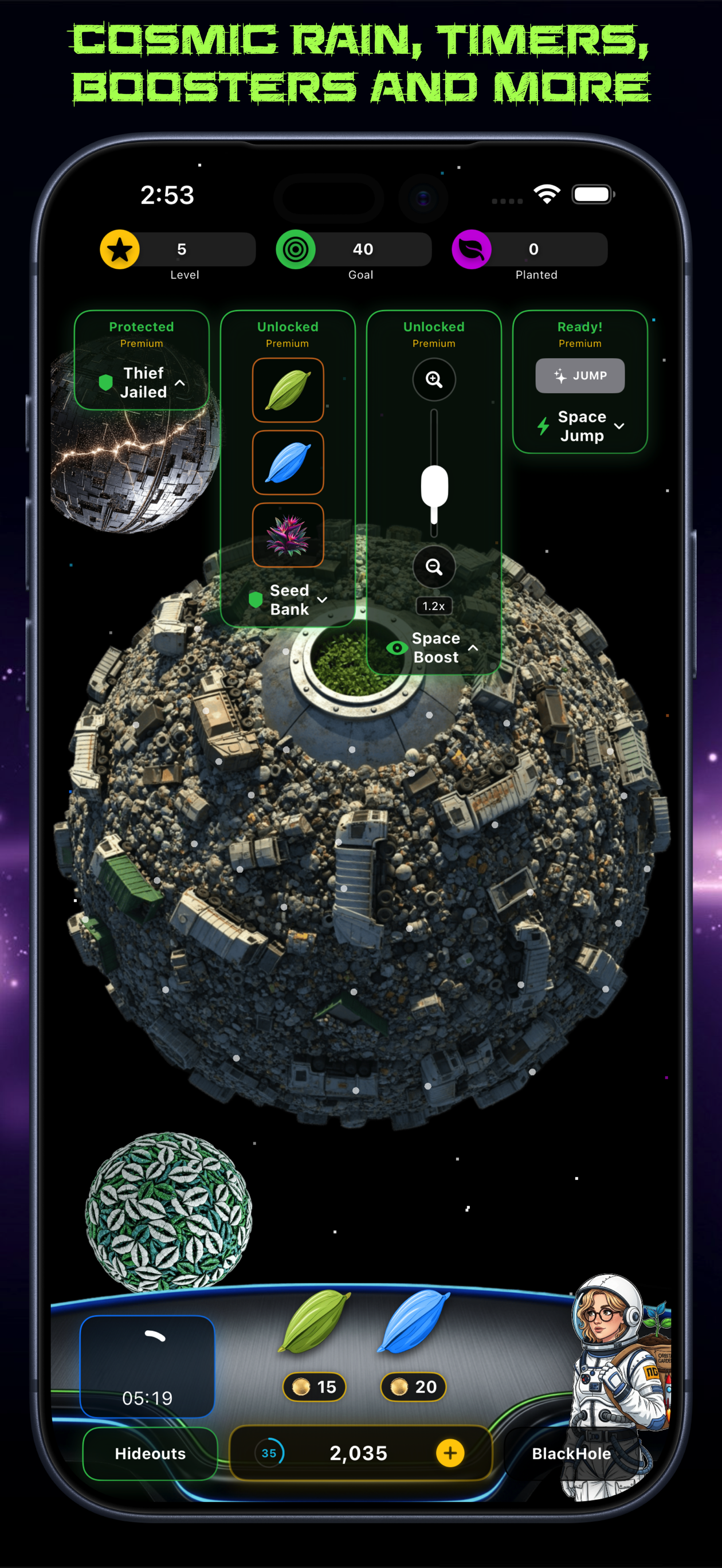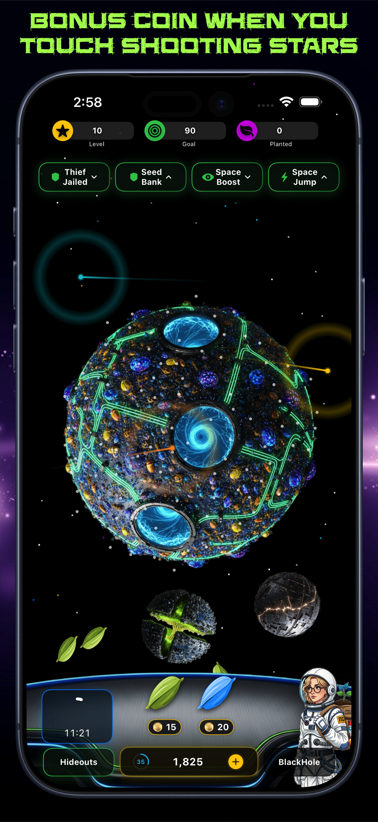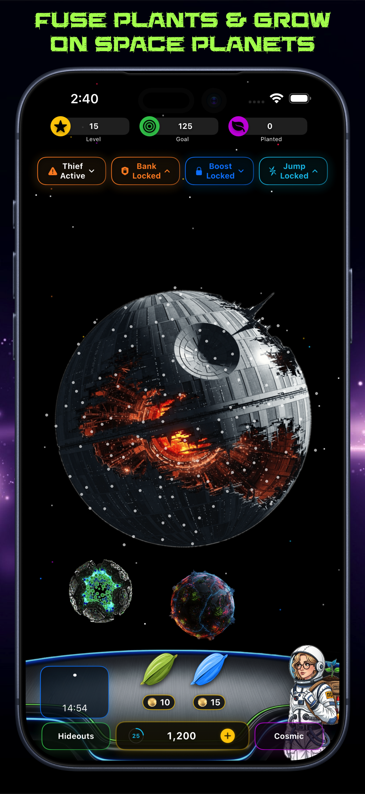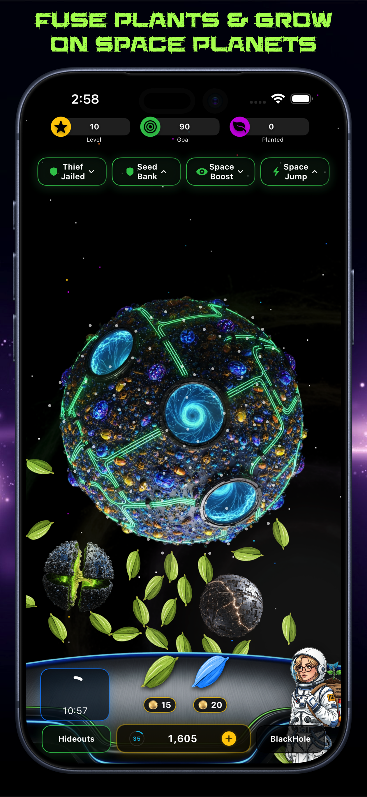 Drag seeds onto planets. Fuse green + blue to create purple plants! Face challenges: orbiting moons, thief visits, storm winds, time limits, and cosmic disasters.